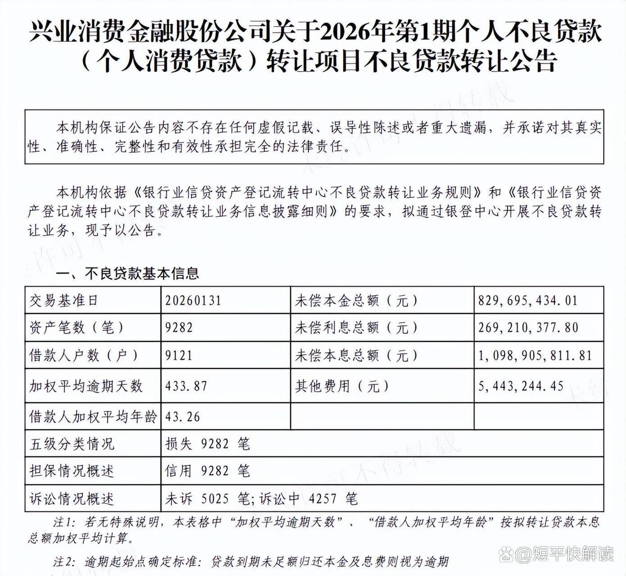 兴业消费金融披露2026年第1-4期个人不良贷款(个人消费贷款)转让项目不良贷款转让公告,未偿本息总额分别为10.99亿元、10.93亿元、7.17亿元、1.78亿元。
