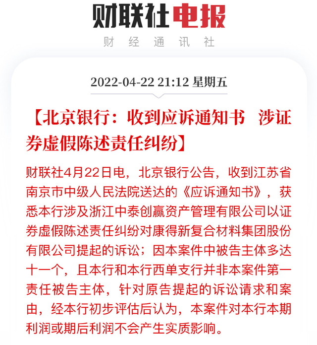 就南京法院通知北京银行股份有限公司应诉事件而言,银行即便在境外设立证券公司,企业不能在国内从事证券业务;北京银行被评价为虚假陈述的可能就是本案的保荐人。根据《证券法》第八十五条规定,保荐人因虚假陈述应当与发行人承担连带赔偿责任的前提条件为致使投资者在证券交易中遭受损失;浙江中泰创赢资产管理有限公司是投资人吗?