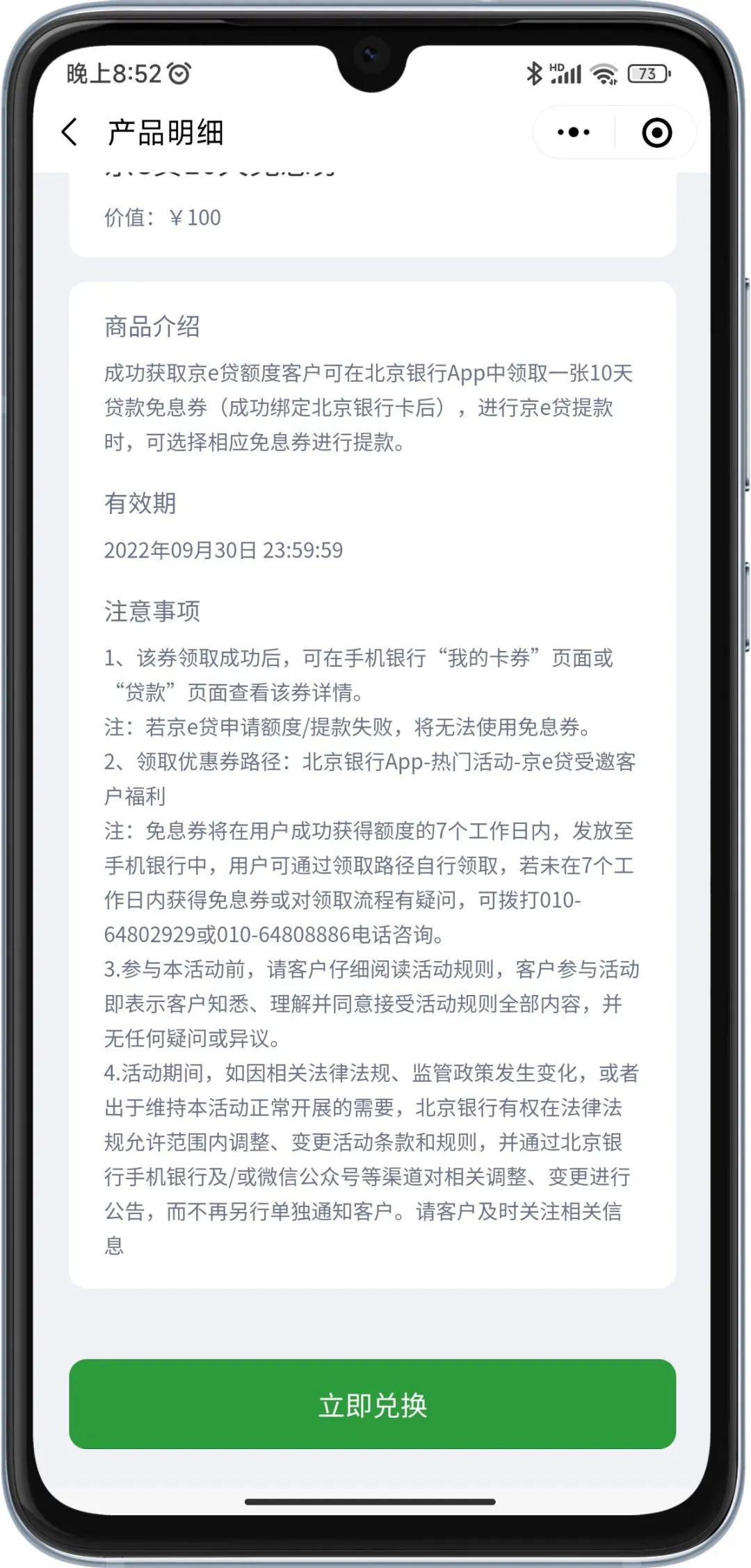 2.选择“北京银行-京e贷10天免息券”,点击“立即兑换”。