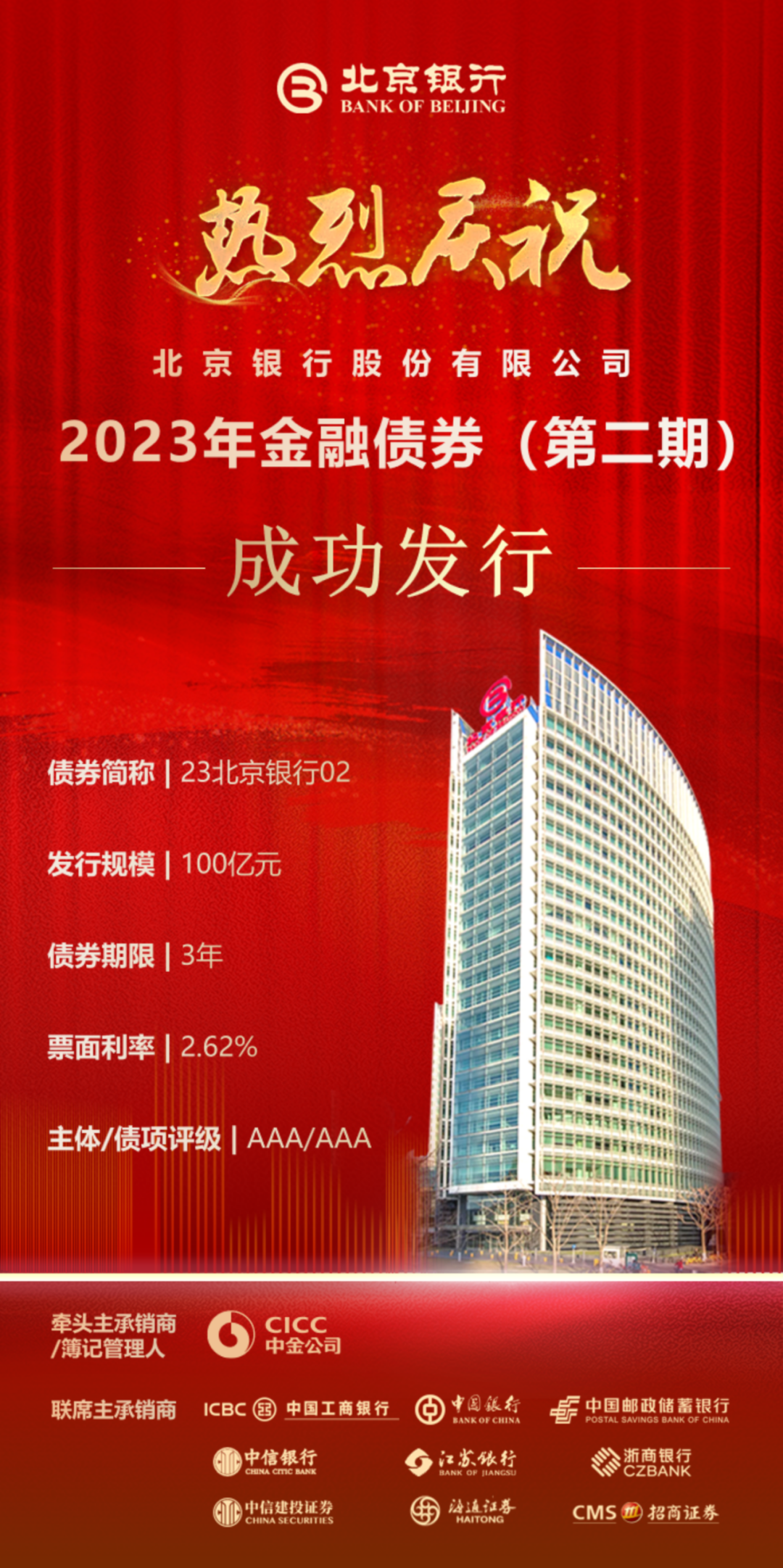 7月26日,北京银行成功发行2023年金融债券(第二期),规模100亿元,固定期限3年,票面利率2.62%。市场参与主体涵盖银行、基金、券商等各类型机构。
