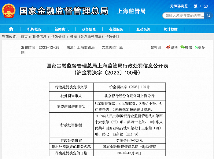 12月29日,国家金融监督管理总局上海监管局行政处罚信息公开表显示,北京银行股份有限公司上海分行被罚款合计260万元,主要违法违规事实包括:虚增存贷款;以贷收费;质价不符;存贷挂钩;未按规定报送统计资料。