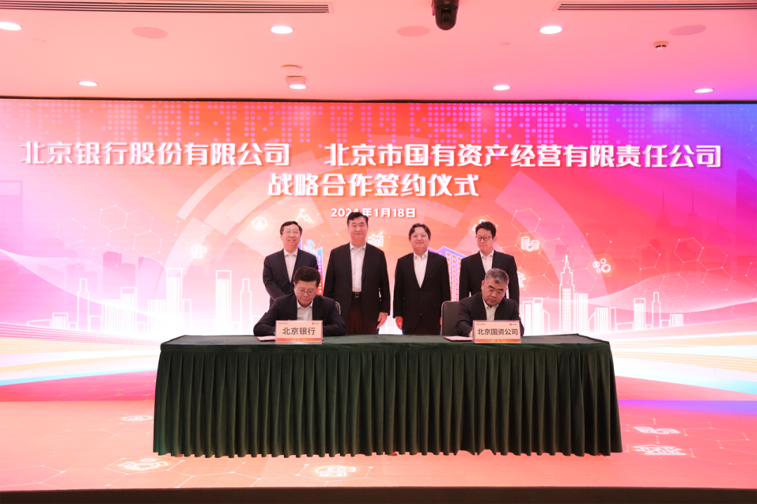 1月18日,北京银行与北京市国有资产经营有限责任公司在北京银行大厦举办战略合作签约仪式。北京国资公司党委书记、董事长赵及锋,党委副书记、董事、总经理张杰,党委副书记、董事闫中,党委常委、总会计师王守业,党委常委、纪委书记、监察专员叶国民,总经理助理杨志海,北京银行党委书记、董事长霍学文,党委副书记、行长杨书剑,党委副书记钱华杰,党委委员、北京市纪委市监委驻北京银行纪检监察组组长谷守元,党委委员、监事长曾颖,副行长戴炜等领导出席签约仪式。