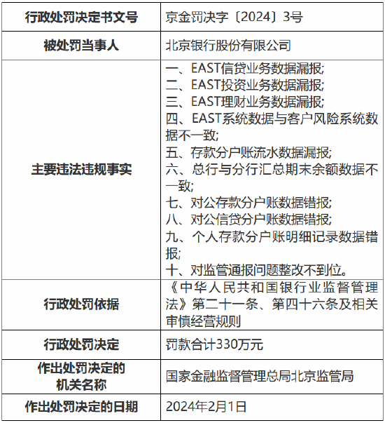 2月8日金融一线消息,国家金融监督管理总局北京监管局行政处罚信息公开表显示,北京银行股份有限公司存在下述10项违法违规行为,合计被罚款330万元。