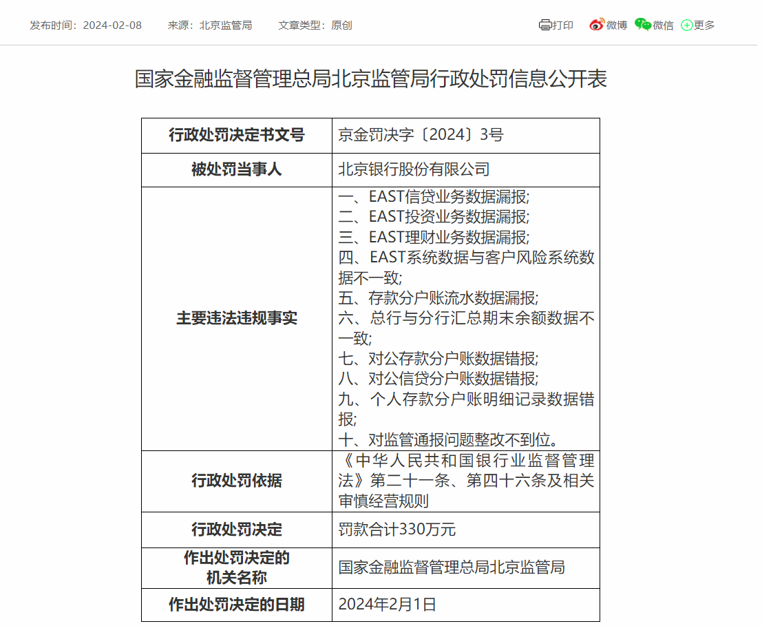 本月初,国家金融监督管理总局北京监管局行政处罚信息公开表显示,北京银行股份有限公司(下称北京银行)被罚款330万元,主要包括多项EAST数据问题、存款分户账流水数据漏报、个人存款分户账明细记录数据错报等十项违法违规事实。