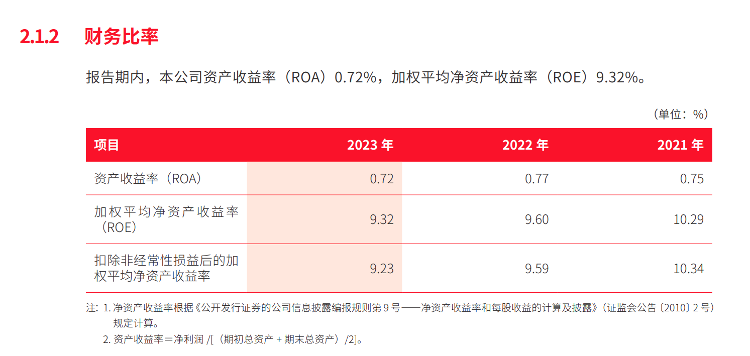 盈利能力指标方面,报告期内北京银行资产收益率(ROA)为0.72%,加权平均净资产收益率(ROE)为9.32%。2019年-2022年,北京银行的ROE分别是11.45%、10.65%、10.29%、9.6%。
