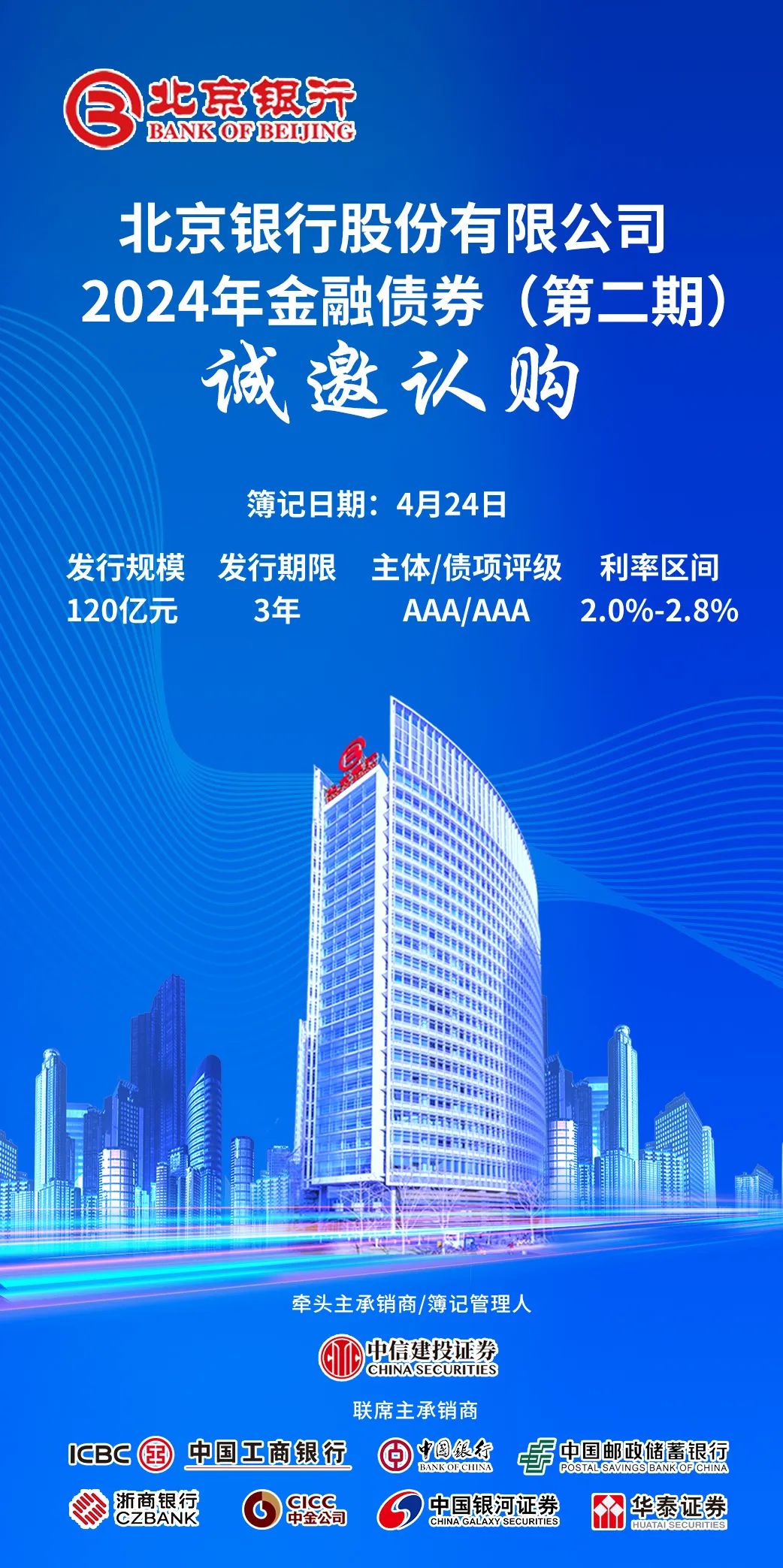 2024年4月24日,北京银行股份有限公司将在全国银行间债券市场发行2024年金融债券(第二期),债券期限为3年,发行规模为人民币120亿元,主体与债项评级均为AAA,诚邀投资人认购询价。