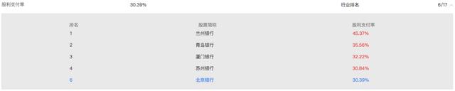表面看起来,北京银行是及格了,但从行业视角来对比,在已公布的分红方案中,截至4月22日,北京银行在城商行里排名只占第6位。