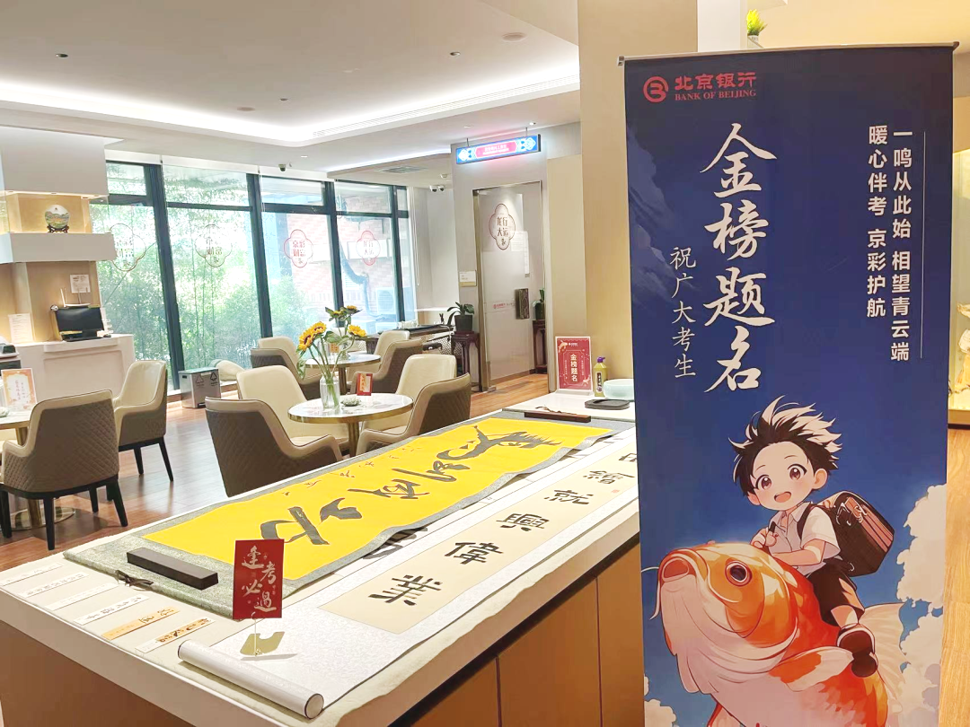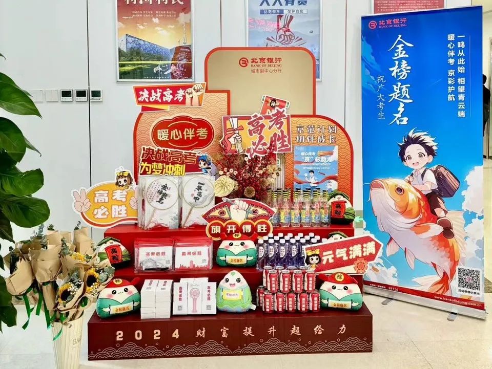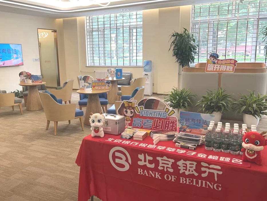 高考期间,北京银行在京200余家网点内,特别设置了“伴考驿站”,开辟了休息区域,为考生和家长提供免费饮品、纳凉团扇、考试文具、应急物资等。部分驿站提供免费打印服务,并设置京苗俱乐部高考减压手工活动区、金榜题名许愿活动区、一举夺“葵”、一举高“粽”留念区,将儿童友好与暖心伴考深度融合。