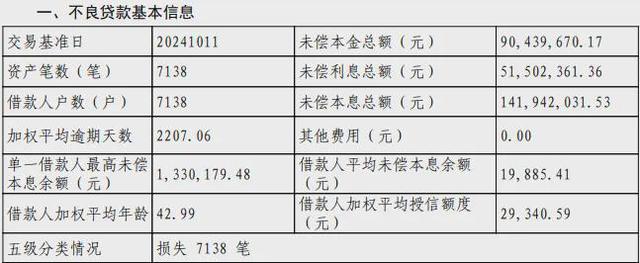 据第1期转让显示,截至今年10月11日,北京银行信用卡涉及个人不良贷款本息约1.42亿元,其中本金9044万元,利息5150.23万元,不良户数达到7173户,加权平均逾期天数达到2200多天,即长达约6年。