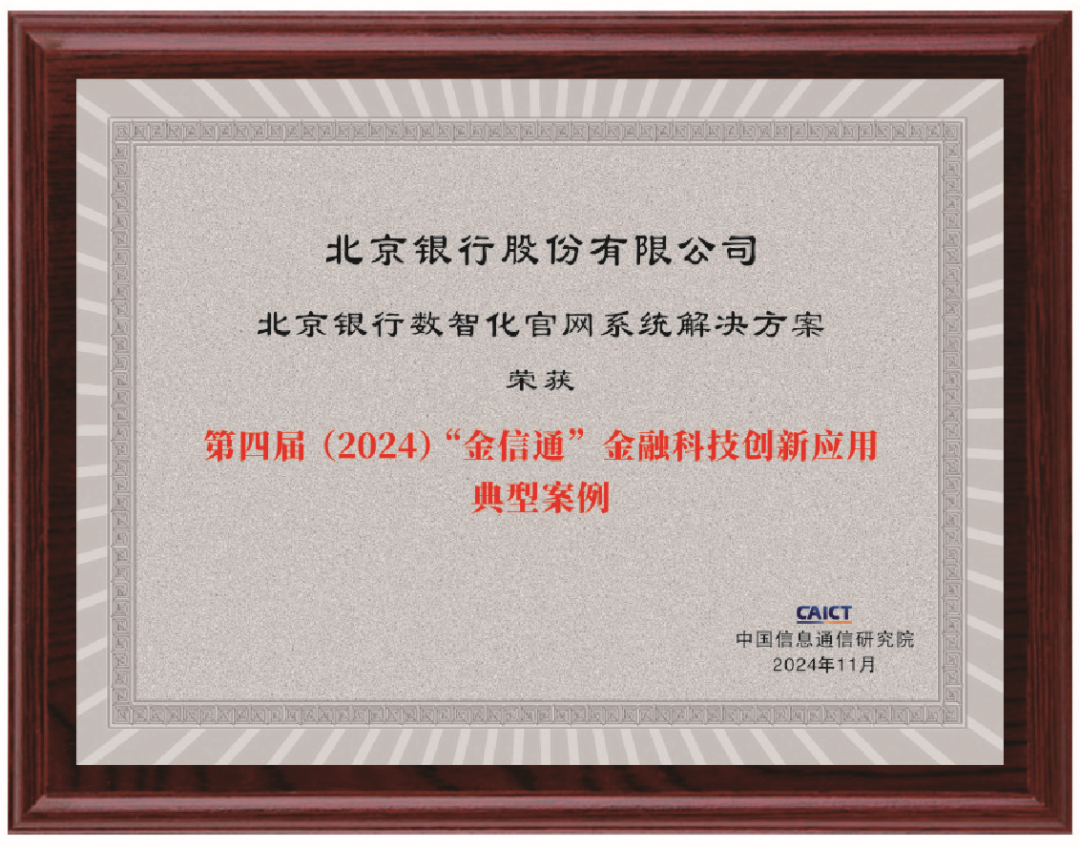 近日,由中国信息通信研究院主办的第四届(2024)“金信通”金融科技创新应用案例评选结果公布。北京银行数智化官网系统凭借全面的业务架构、便捷的金融场景服务、出色的客户体验,获评“金信通”金融科技创新应用典型案例。
