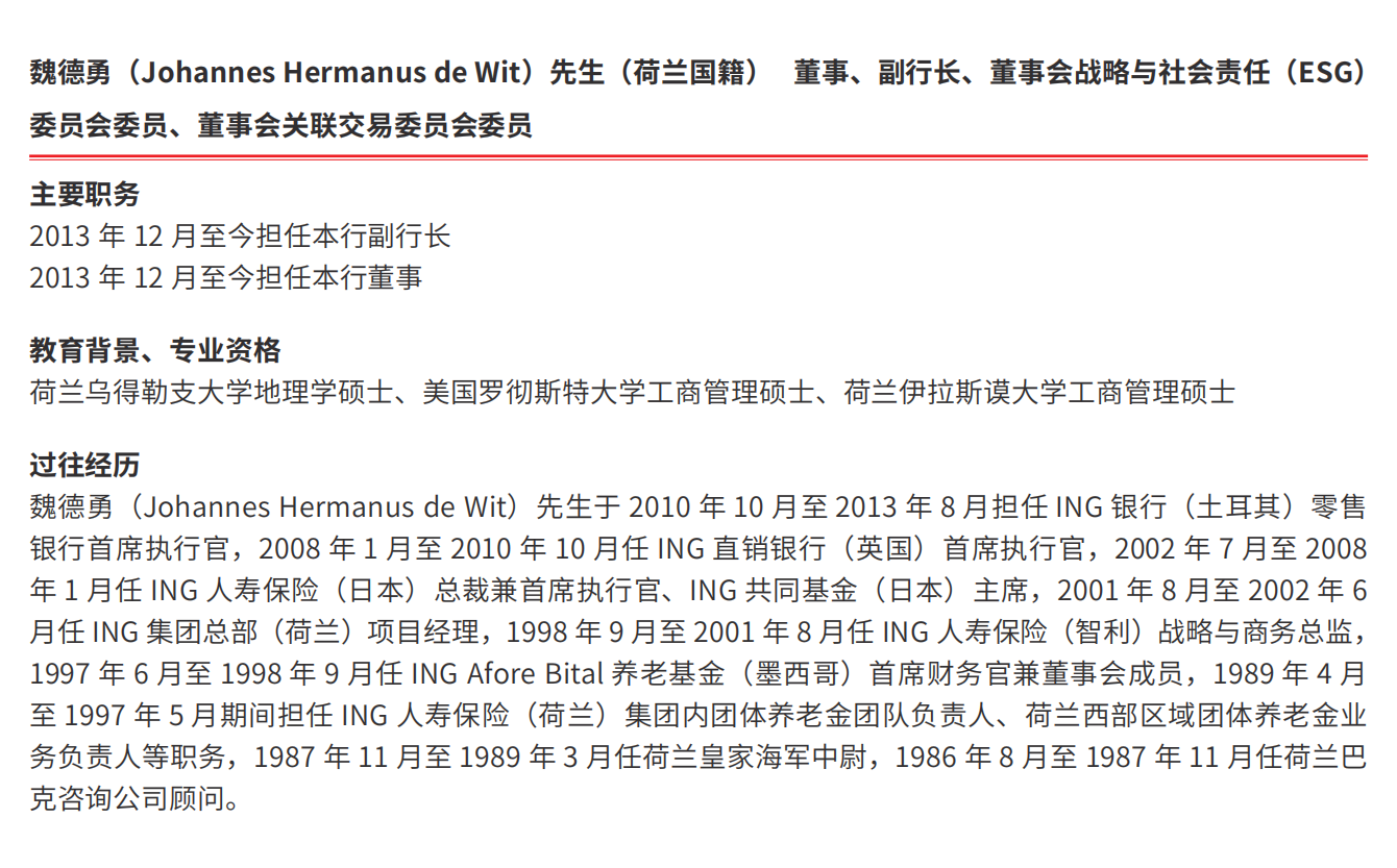 简历显示,Johannes Hermanus de Wit,荷兰国籍,1962年生,荷兰乌得勒支大学地理学硕士、美国罗彻斯特大学工商管理硕士、荷兰伊拉斯谟大学工商管理硕士。Johannes Hermanus de Wit1986年8月至1987年11月任荷兰巴克咨询公司顾问,1987年11月至1989年3月任荷兰皇家海军中尉,1989年4月至1997年5月期间担任ING人寿保险(荷兰)集团内团体养老金团队负责人、荷兰西部区域团体养老金业务负责人等职务,1997年6月至1998年9月任ING Afore Bital养老基金(墨西哥)首席财务官兼董事会成员,1998年9月至2001年8月任ING人寿保险(智利)战略与商务总监,2001年8月至2002年6月任ING集团总部(荷兰)项目经理,2002年7月至2008年1月任ING人寿保险(日本)总裁兼首席执行官、ING共同基金(日本)主席,2008年1月至2010年10月任ING直销银行(英国)首席执行官,2010年10月至2013年8月担任ING银行(土耳其)零售银行首席执行官。