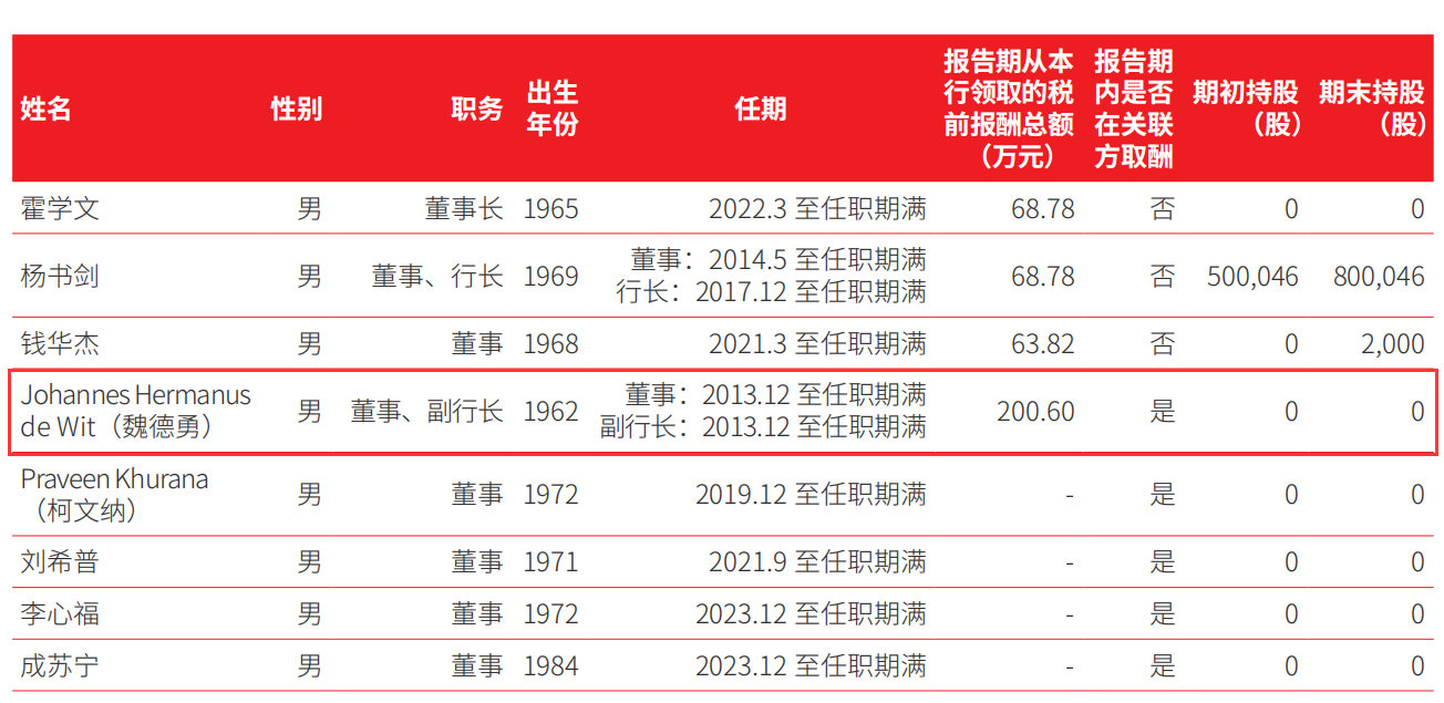 据北京银行年报披露,Johannes Hermanus de Wit,2013年12月起担任该行董事和副行长,至今其履职时间已超过11年。Johannes Hermanus de Wit 2023年税前薪酬为200.60万元。