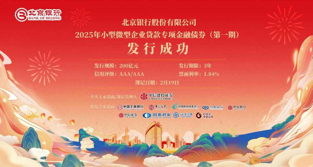 2月21日,北京银行成功发行2025年第一期小型微型企业贷款专项金融债券,发行规模200亿元,固定期限3年,票面利率1.84%,票面利率创历史新低。本期金融债市场认购踊跃,参与机构覆盖国有大行、城商行、农商行、外资银行、保险机构、基金公司、证券公司等多层次投资者,全场认购倍数达两倍。