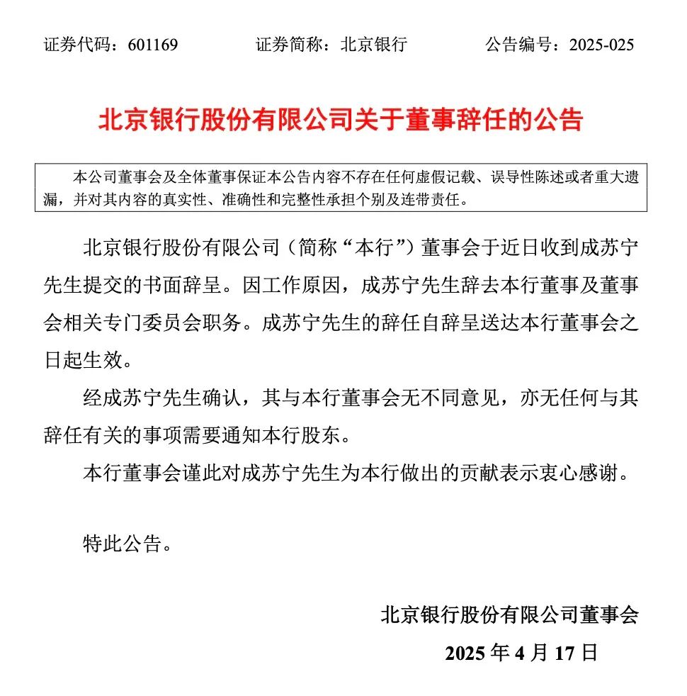 金融虎讯 4月17日消息,日前,北京银行股份有限公司发布关于董事辞任的公告。