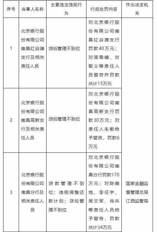 其中,北京银行南昌分行因贷款管理不到位、违规调整还款计划、贷后管理不到位,被罚款170万元;对陈薇地、李征宇、周文军、肖兵等责任人员给予警告,罚款共计34万元。