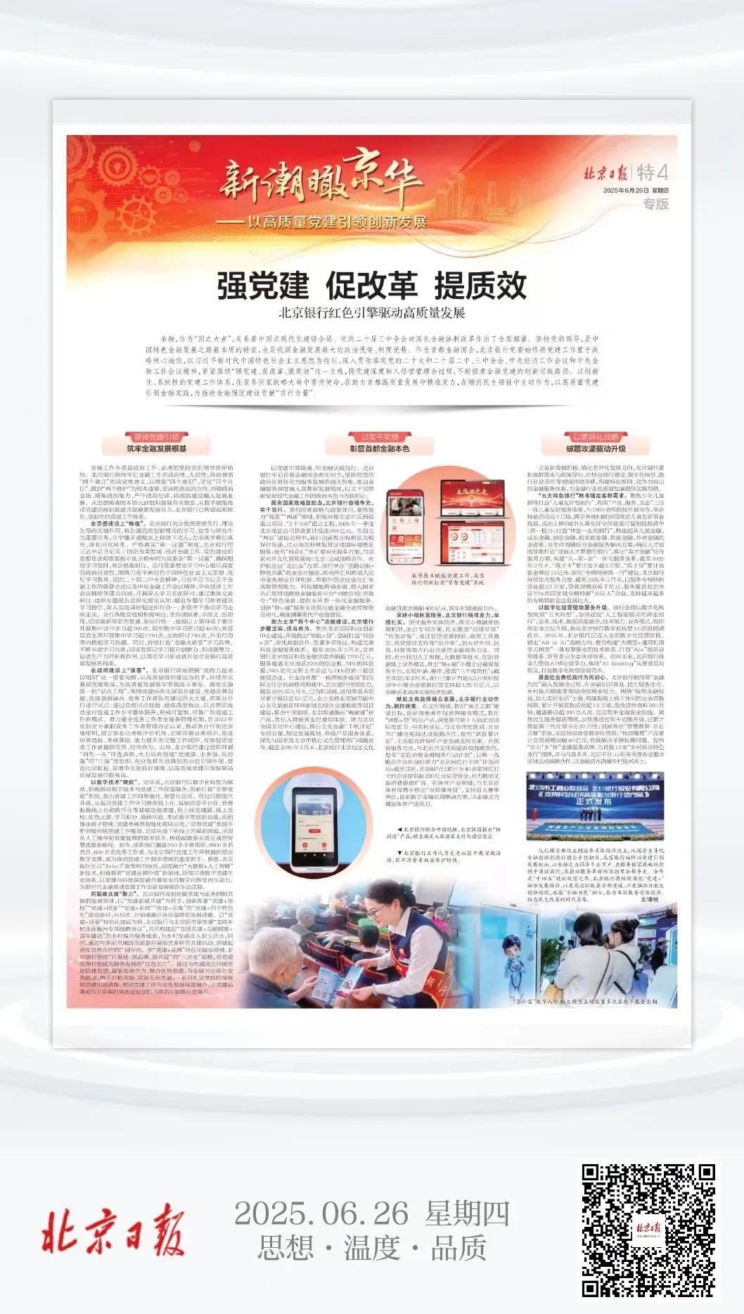 6月26日,《北京日报》“新潮瞰京华——以高质量党建引领创新发展”专栏,专版报道《强党建促改革提质效北京银行红色引擎驱动高质量发展》。