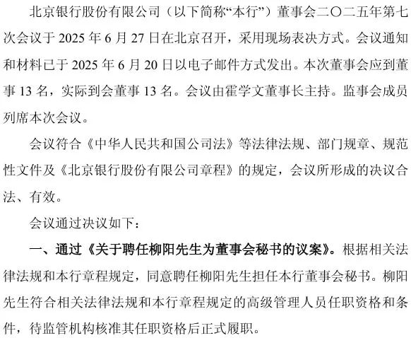 6月27日,北京银行股份有限公司(以下简称“北京银行”,601169.SH)召开了董事会2025年第七次会议。在本次会议中,《关于聘任柳阳先生为董事会秘书的议案》得到了全票通过。