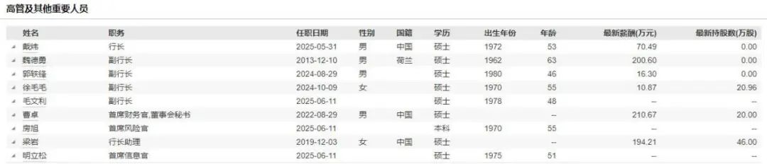 年初老将霍学文连任董事长、原行长杨书剑转任华夏银行董事长,副行长戴炜在代理行长后于5月转正,原副行长王健则在2024年12月离职。同时,郭轶锋在去年8月底、徐毛毛在去年10月初、毛文利在今年6月11日先后就位副行长职务。而房旭、明立松,也在今年6月初分别担任北京银行首席风险官、首席信息官。