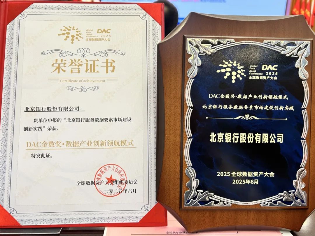 近日,以“全民共享数据资产红利”为主题的第三届全球数据资产大会(DAC Global)在厦门举办,来自全球数据资产领域顶尖专家、政府领导、产业精英及企业代表齐聚一堂,共同探讨数据资产化发展新路径。活动上,北京银行凭借“北京银行服务数据要素市场建设创新实践”案例,以及在数据产业服务领域的创新模式和实践成果,脱颖而出,荣获2025全球数据资产大会“DAC金数奖·数据产业创新领航模式”奖项,成为唯一获此殊荣的银行类金融机构。