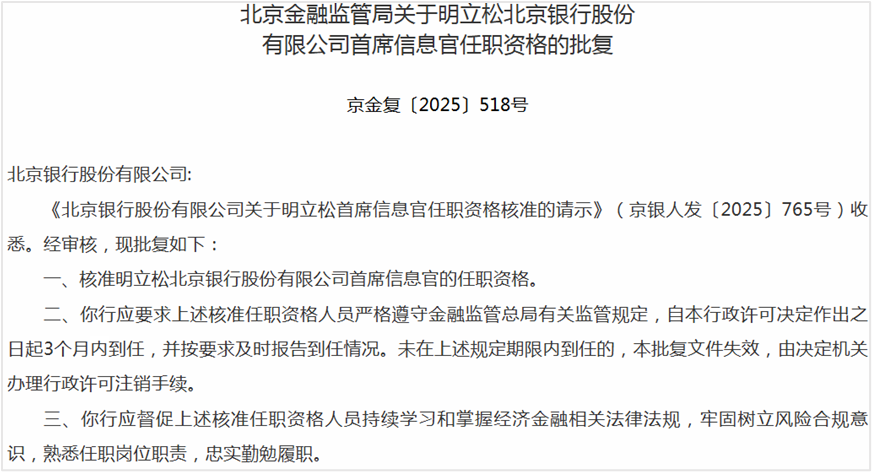 8月29日,国家金融监督管理总局北京监管局发布的批复显示,核准明立松北京银行首席信息官的任职资格。