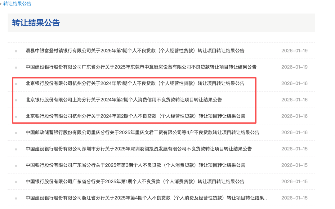近日,据银登网披露的信息,北京银行杭州分行2024年第1期、第2期个人经营性不良贷款,以及上海分行2024年第2期个人消费信用不良贷款转让项目结果均已出炉,全部由浙商资产揽下。