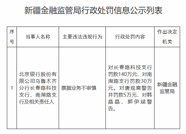 北京银行股份有限公司乌鲁木齐分行长春路科技支行、南湖路支行及相关责任人因票据业务不审慎对长春路科技支行罚款140万元,对南湖路支行罚款30万元。对唐观爽警告并罚款5万元,对韩晶晶、郭伊斌警告。