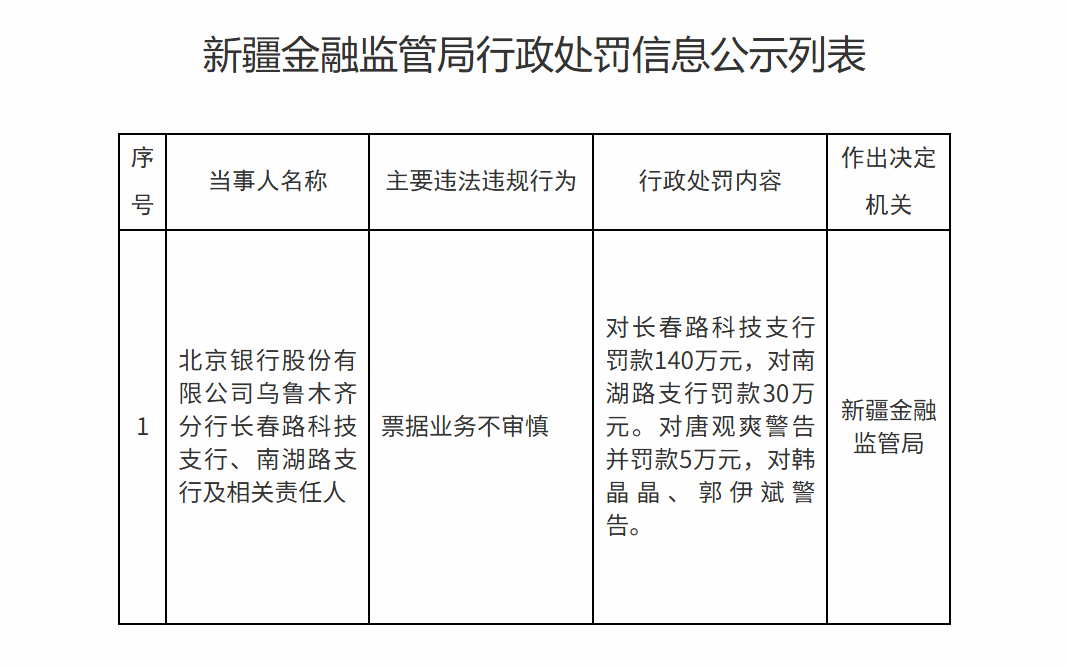 4月10日,新疆金融监管局公布了一张北京银行的百万罚单。因票据业务不审慎,新疆金融监管局对北京银行股份有限公司乌鲁木齐分行长春路科技支行、南湖路支行分别罚款140万元、30万元。对唐观爽警告并罚款5万元,对韩晶晶、郭伊斌警告。