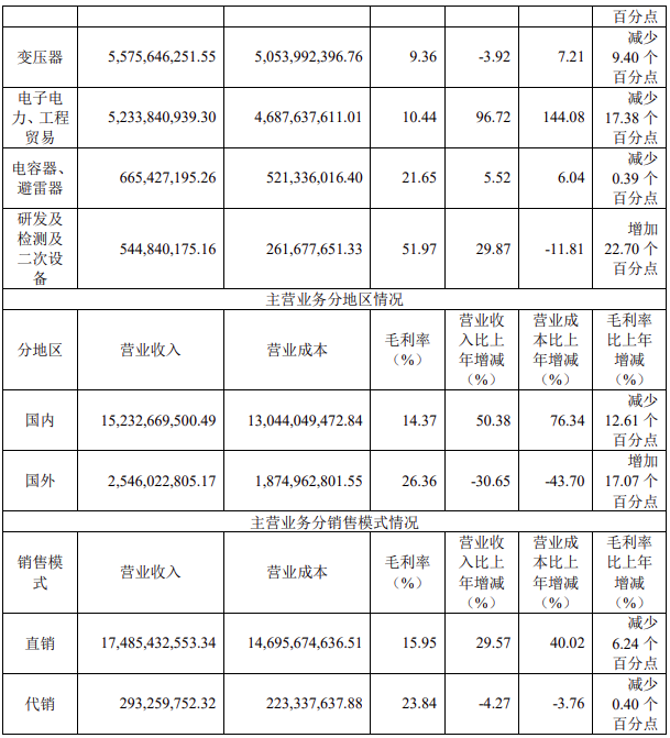 公司主营业务为输配电及控制设备研发、设计、制造、销售、检测、相关设备成套、技术研究、服务与工程承包等业务。公司主导产品包括110kV及以上电压等级的高压开关(GIS、GCB、隔离开关、接地开关)、变压器(电力变压器、换流变压器)、电抗器(平波电抗器、并联电抗器)、电力电容器、互感器(CVT、CT、PT)、绝缘子(电站电瓷产品、复合材料绝缘子产品)、套管、氧化锌避雷器、直流输电换流阀等。