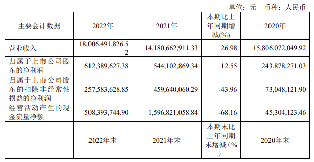 2022年度,公司实现营业收入180.06亿元,较上年同期141.81亿元增加38.25亿元,增幅26.98%,归属于上市公司股东的净利润6.12亿元,较上年同期5.44亿元增加0.68亿元,增幅12.55%,总资产408.43亿元,较上年同期388.73亿元增加19.7亿元,增幅5.07%。营业成本150.48亿元,较上年同期的111.04亿元增加39.44亿元,增幅35.52%,利润总额8.69亿元,较同期6.67亿元增长2.01亿元,增幅30.18%;净利润7.14亿元,较同期6.03亿元增长1.10亿元,增幅18.36%。