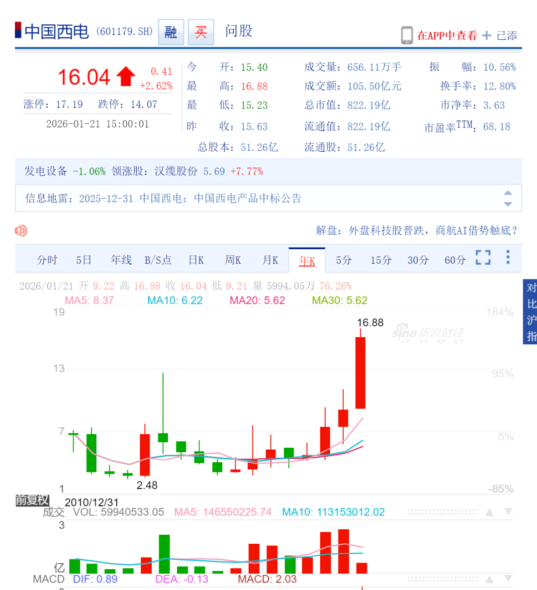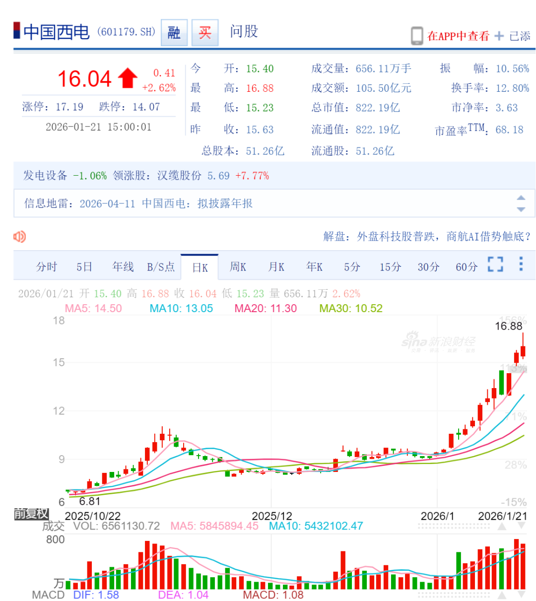 1月21日,中国西电盘中创历史股价新高16.88元,收涨2.62%于16.04元,市值822亿元。