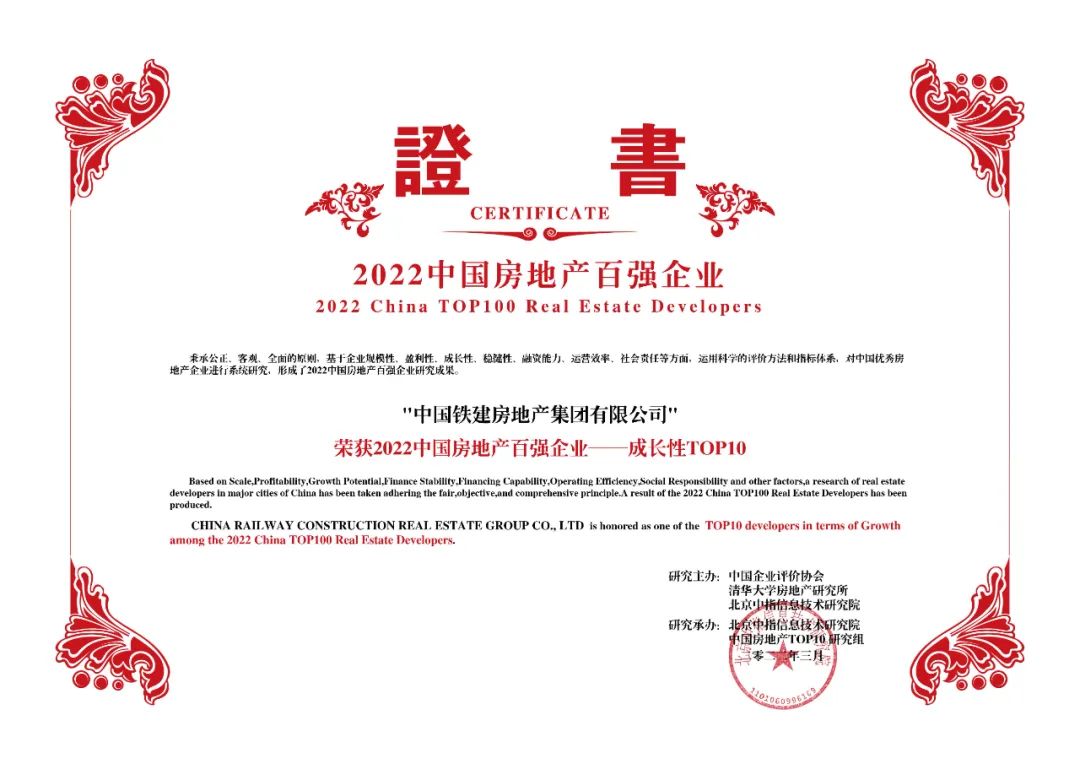 面对全新的市场环境,中国铁建地产实现了稳健的增长,综合实力不断提升,荣获“2022中国房地产百强企业”、“2022中国房地产百强企业——成长性TOP10”;中国铁建地产集团党委书记、董事长李兴龙荣获“2022中国房地产百强企业贡献人物”荣誉。
