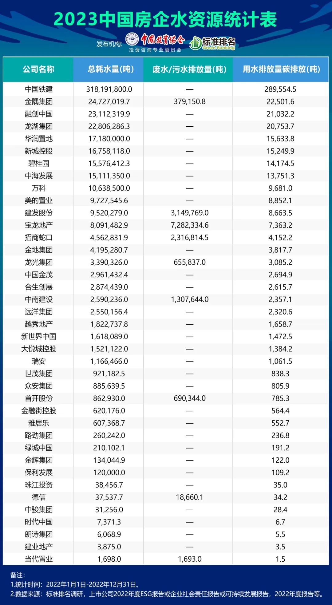 需要指出的是,用水和污水排放量较少的上市房企,所披露的数据仅为其办公用水量和污水排放量。当代置业披露2022年其用水量仅为1698立方米,但是其2022年房屋开工和竣工面积均超过62万平方米,按照施工建设每平方米建筑用水0.6立方米估算,当代置业2022年的用水量也已超37万立方米。