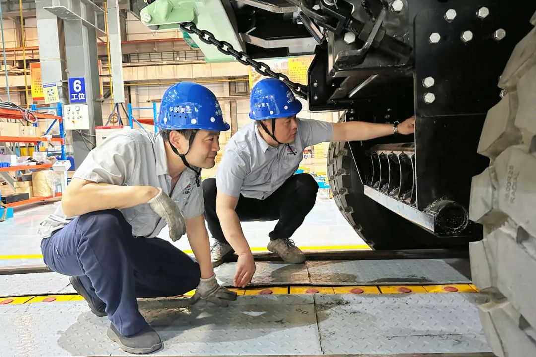 中铁长安重工公司智能制造分公司工人检查车辆后桥装配
