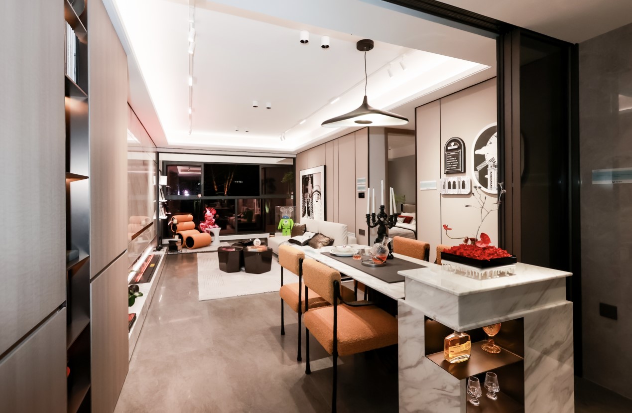 约103m2创新户型,将原本3.3m-3.5m面宽的客餐厅空间,合并成一个5m*5m的方形空间,它不再以电视墙为主导,可以根据不同业主的生活体验进行功能布局,既保证了L型双采光,并从结构上颠覆了传统客厅设计,让空间得以多元化应用。