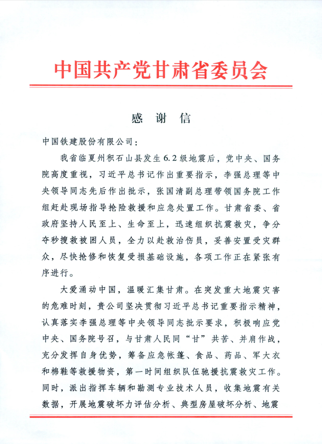 日前,中国铁建收到了一封来自甘肃省委省政府的感谢信。信中对中国铁建相关单位在地震发生后第一时间援助甘肃省临夏州表示真挚的感谢。