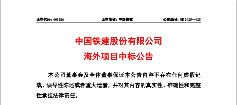近日,本公司下属中铁十一局集团有限公司、中铁十二局集团有限公司中标中吉乌铁路先期开工段(吉尔吉斯共和国境内段重点控制性工程)三座隧道工程 ZJWZQ-2 标段、ZJWZQ-3 标段施工总承包项目,合计合同金额约人民币 25.87 亿元。