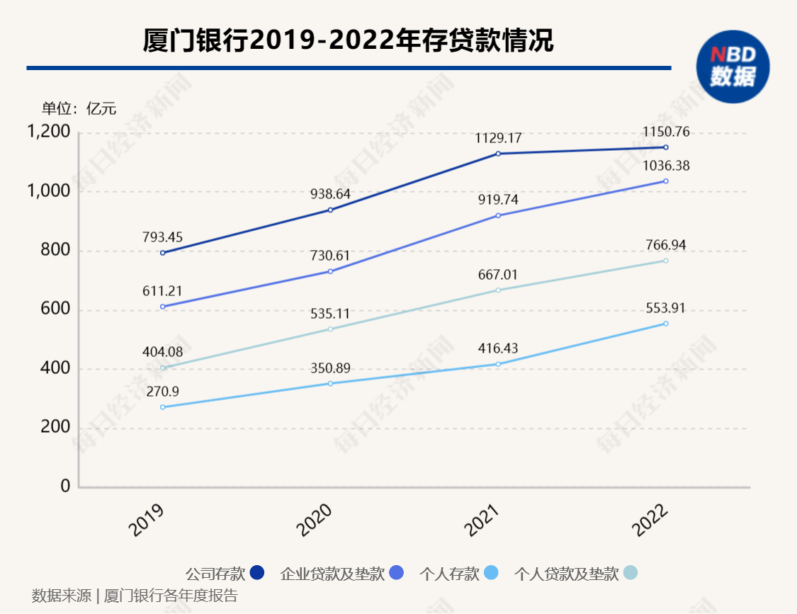2022年,厦门银行深化落地“做大零售、做强对公、做深两岸、做优资金”业务发展战略。作为核心业务压舱石的对公业务方面,截至2022年末,厦门银行客户存款余额(不含保证金存款和其他存款)1150.76亿元,增幅1.91%;企业贷款和垫款余额(不含票据贴现)1036.38亿元,增幅12.68%。