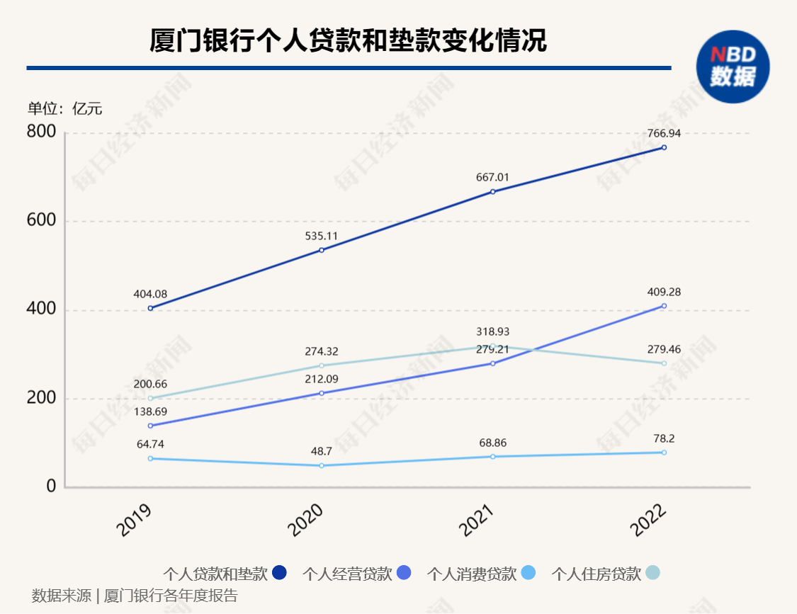 截至2022年末,厦门银行个人消费贷款余额78.20亿元,较上年增长9.34亿元,增幅13.56%,其中信用消费贷款产品24.98亿元,较上年末增长21.33亿元,增幅584.09%。年报显示,该行主推的某线上信用消费贷款产品上线后注册人数近13万人,累计投放25亿元,余额14亿元,平均投放利率达到7.3%,对个人贷款利差提升作用凸显,已成为新的利润增长点