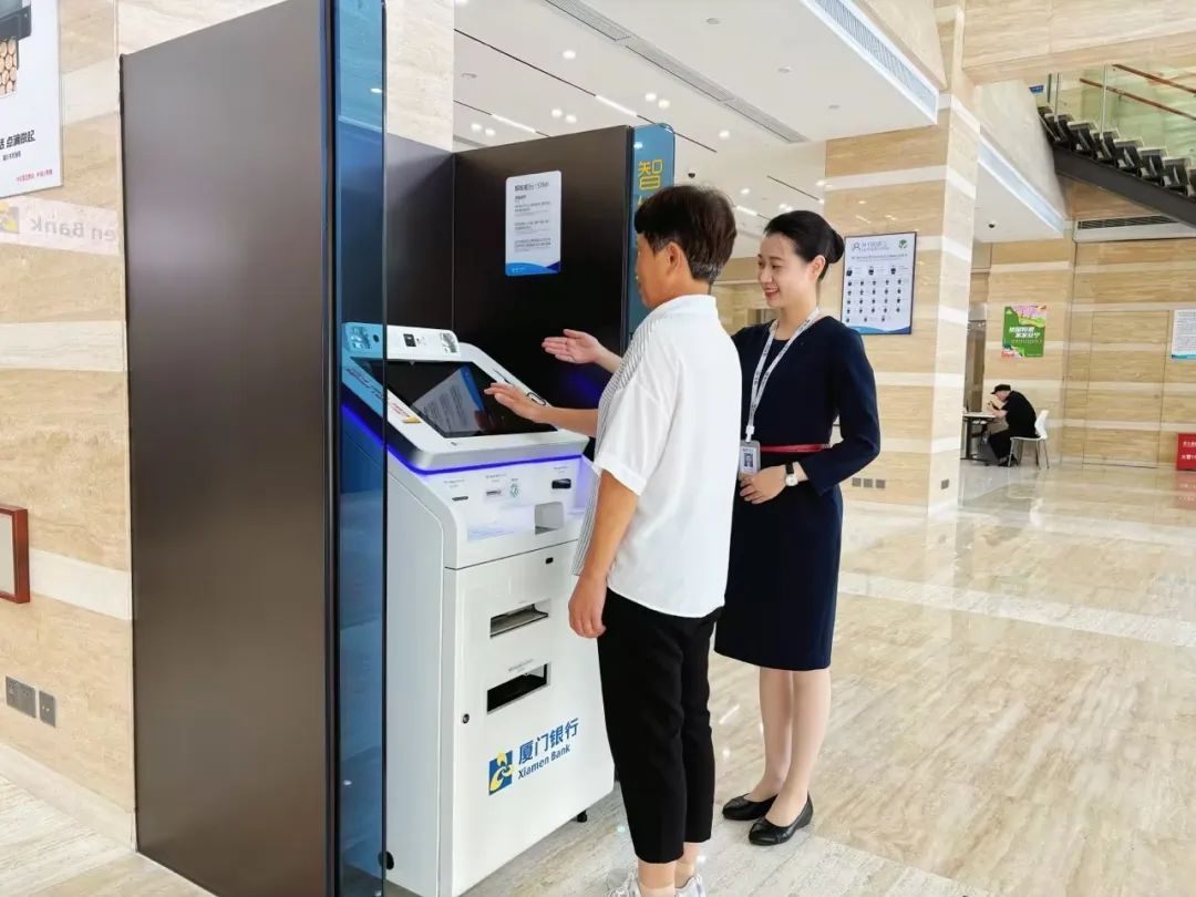 ▲厦门银行工作人员协助老年客户在柜面版智能柜台高效办理业务。