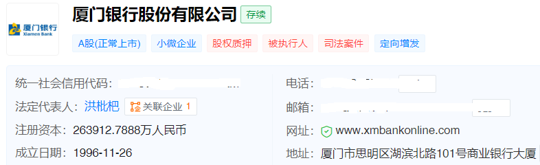 厦门银行成立于1996年11月26日,注册资本为263912.7888万元人民币,法定代表人是洪枇杷。
