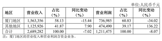 财报显示,上半年厦门银行在本部的营收(含资金业务)出现较大波动,厦门地区实现营业收入15.63亿元,同比下降15.44%;实现营业利润7.37亿元,同比下降34.02%。