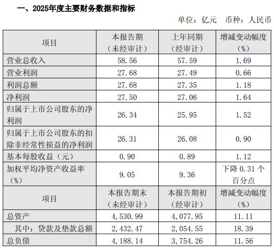 与资产端的强劲扩张形成反差的是,该行营收和净利润仅实现个位数增长——2025年厦门银行实现营业收入58.56亿元,同比增长1.68%;归母净利润26.34亿元,同比增长1.50%。