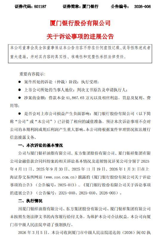 2026年3月6日晚间,厦门银行(601187.SH)发布诉讼进展公告,披露其与厦门银祥油脂有限公司(下称“银祥油脂”)、东方集团股份有限公司(下称“东方集团”)、厦门银祥集团有限公司(下称“银祥集团”)的4.19亿元金融借款合同纠纷,已正式进入强制执行阶段。厦门市中级人民法院于3月5日受理该执行申请,出具(2026)闽02执2459号《受理案件通知书》,标志着这场历时近一年的金融纠纷进入债权追偿的关键环节。