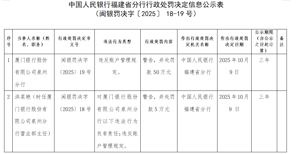 据《中国人民银行福建省分行行政处罚决定信息公示表(闽银罚决字〔2025〕18-19号)》显示,2025年10月9日,厦门银行股份有限公司泉州分行因“违反账户管理规定”,中国人民银行福建省分行对其警告,并处罚款50万元。