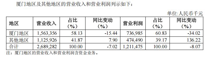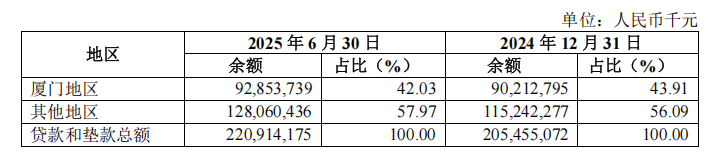 截至报告期末,其厦门地区发放的贷款和垫款余额928.54亿元,占其贷款和垫款总额的42.03%;其他地区发放的贷款和垫款余额1280.60亿元,占公司贷款和垫款总额的57.97%。
