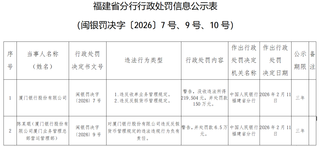 《中国人民银行福建省分行行政处罚决定信息公示表(闽银罚决字〔2026〕7号、9号、10号)》显示,2026年2月11日,厦门银行股份有限公司因“1.违反收单业务管理规定。2.违反反假货币管理规定”,对其给予警告,没收违法所得219,504元,并处罚款150万元。