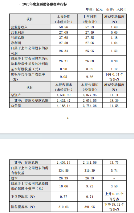 而根据厦门银行2026年1月披露的2025年度业绩快报来看,2025年,该行实现营业总收入58.56亿元,同比增长1.69%;归属于上市公司股东的净利润26.34亿元,同比增长1.52%。但在这份业绩快报里,厦门银行不良贷款率为0.77%,上升0.03个百分点;拨备覆盖率312.63%,下降79.32个百分点;加权平均净资产收益率9.05%,下降0.31个百分点。