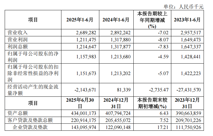 从厦门银行2025年半年度报告看,截至2025年6月末,该行营业收入和归属于母公司股东的净利润同比有所下降。其中,营业收入26.89亿元,同比下降7.02%,归属于母公司股东的净利润11.58亿元,同比下降4.59%,净息差1.08%,较上年同期下降0.06个百分点。