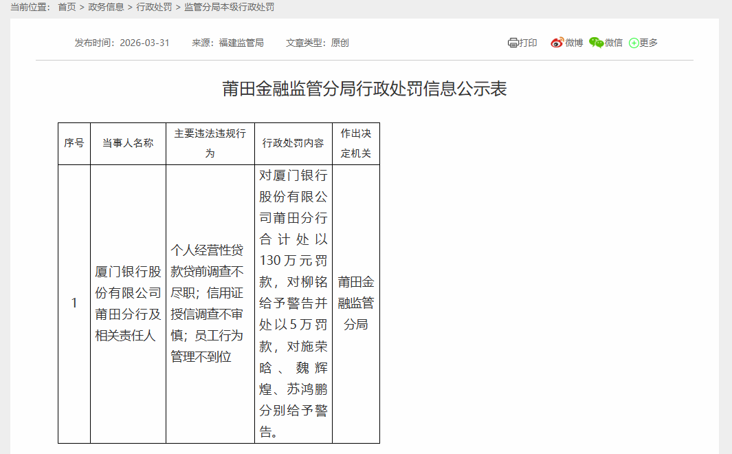 2026年3月31日,《莆田金融监管分局行政处罚信息公示表》显示,厦门银行股份有限公司莆田分行及相关责任人,因“个人经营性贷款贷前调查不尽职;信用证授信调查不审慎;员工行为管理不到位”,莆田金融监管分局对厦门银行股份有限公司莆田分行合计处以130万元罚款。