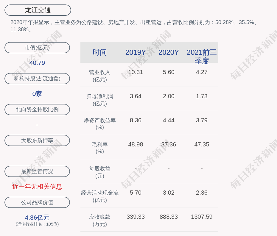 2020年年报显示,龙江交通的主营业务为公路建设、房地产开发、出租营运,占营收比例分别为:50.28%、35.5%、11.38%。